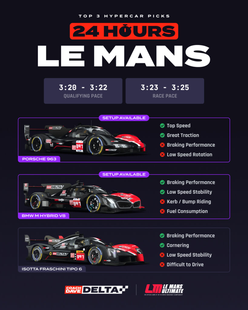 We’ve got setups ready for the 24 Hours of Le Mans this weekend in LMU and you can get them right now in Delta.