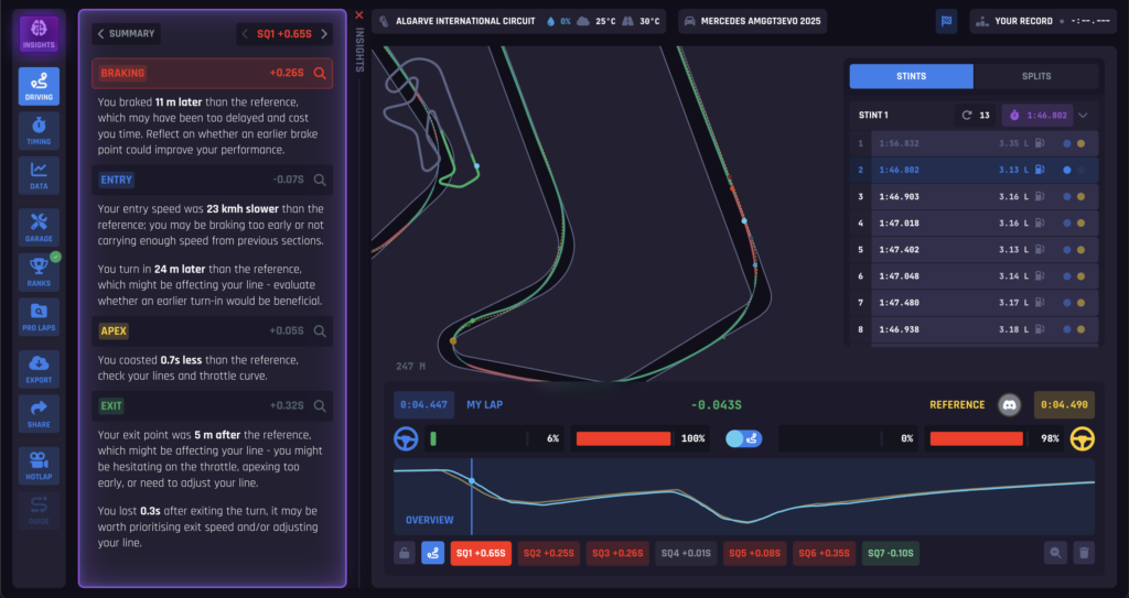 Delta removes the guesswork from that process. It tells you exactly where the gap is, what the reference driver is doing differently, and gives you the specific changes to go out and work on. Combined with a structured approach to prioritising corners and building reference points like James does, it is the most efficient way to get up to speed on an unfamiliar circuit.