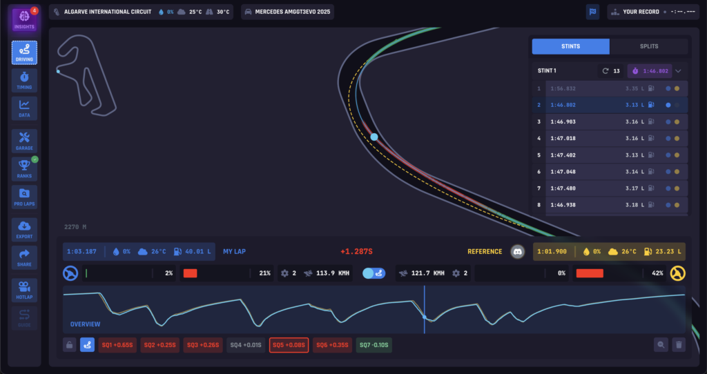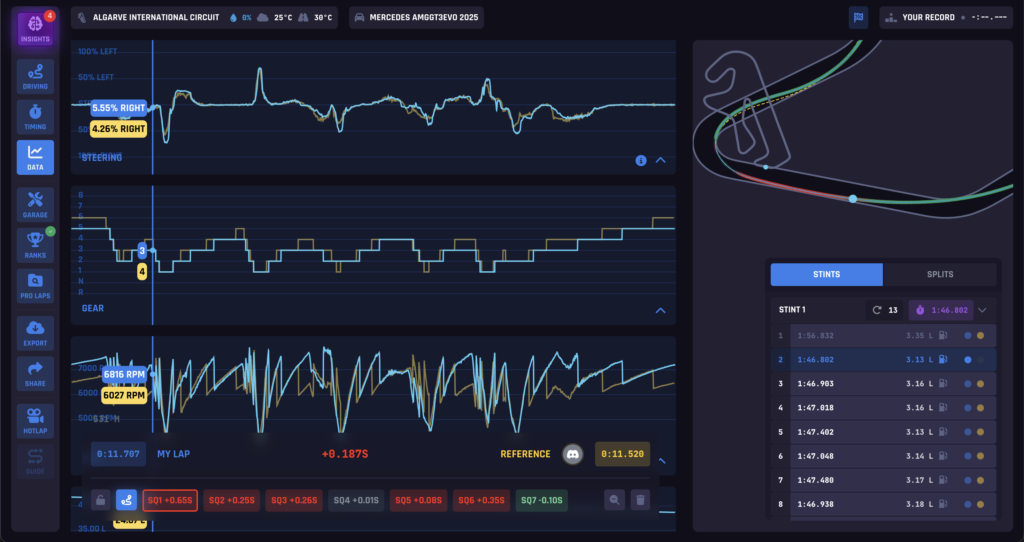 When comparing laps in Delta during a session, use your session’s best lap as the reference rather than your all-time best. Your session best lap was set in the same conditions, at a similar point in tyre life, with driving that reflects your current understanding of the circuit. It is the most representative baseline for what you are doing right now.